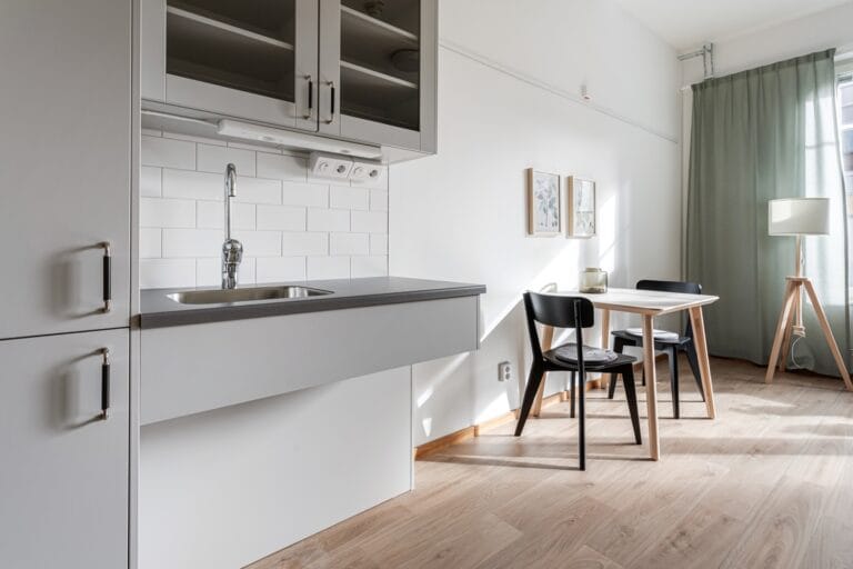 Din egen lägenhet är ca 30 kvadratmeter och utrustad med trinettkök med kylskåp, garderob. Badrummet är handikappanpassat med dusch. Trygghetslarm och rörelselarm finns. Lägenheten har en höj- och sänkbar säng, i övrigt möblerar du med dina egna möbler och saker.