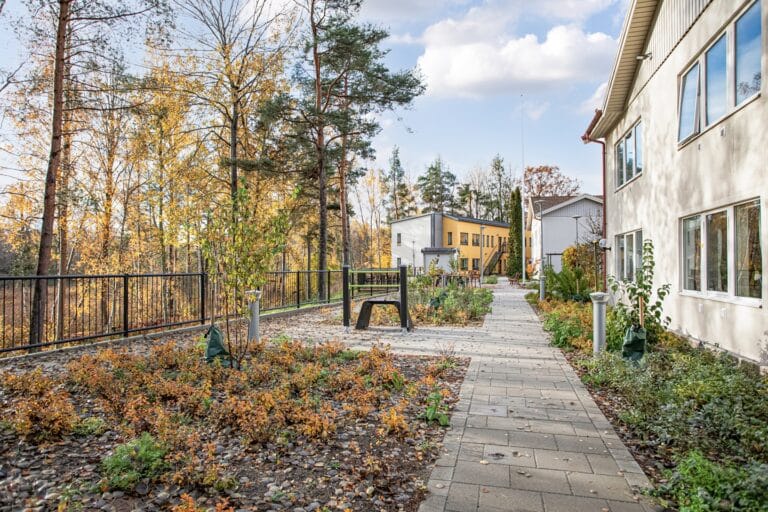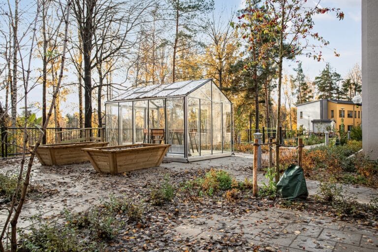 På Villa Sarvträsk finns en härligt grönskande trädgård med uteplats. Även trädgården har utökats i samband med utbyggnaden. Här finns utekök, växthus och en pergola. Byggnaden har stora gemensamma balkonger där de boende gärna äter om vädret tillåter.