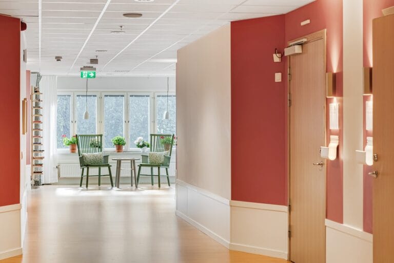 Villa Vallonen är möblerat utifrån Vardagas boendekoncept med fokus på nordisk design. Här kombineras funktion och form till en boendemiljö som är anpassad för de boendes fysiska behov samtidigt som miljön är ombonad och hemtrevlig. Färger och inredningsdetaljer är med grund i forskning och evidens anpassade till det åldrande ögat och underlättar för personer med demenssjukdom att orientera sig på boendet.